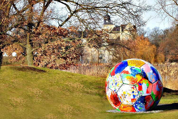 der WM-Ball an der Nordseite der Volkswagen Arena: die Skulptur im Allerpark soll an die "WM Frauen Fussball 2011" erinnern
