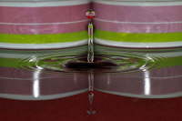 Für die Erstellung von Tropfenfotos benötigte ich ein stabiles Stativ mit angehängten Gewicht und einen Funk Fernauslöser, um beim Auslösen keine Vibration zu erzeugen. Die Belichtungszeit liegt bei 1/250s [es reicht der integrierte Blitz der Kamera]. Zusätzlich oder nur extern benutzte Blitzgeräte sind natürlich sehr hilfreich; verwende ich aber nicht. Manuelle Fokussierung versteht sich von selbst. Man braucht etwas Übung, um den richtigen Winkel (Objektivachse zur Flüssigkeitsoberfläche) zu finden. Das ist sehr davon abhängig, welche Behältergröße man wählt und welchen freien Bildausschnitt man haben will.